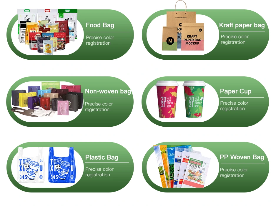 Adequado para PE, BOPP, PET, CPP, papel e outros substratos flexíveis, ideal para embalagens de alimentos, sacolas de compras, etiquetas e impressão de diversas embalagens flexíveis.